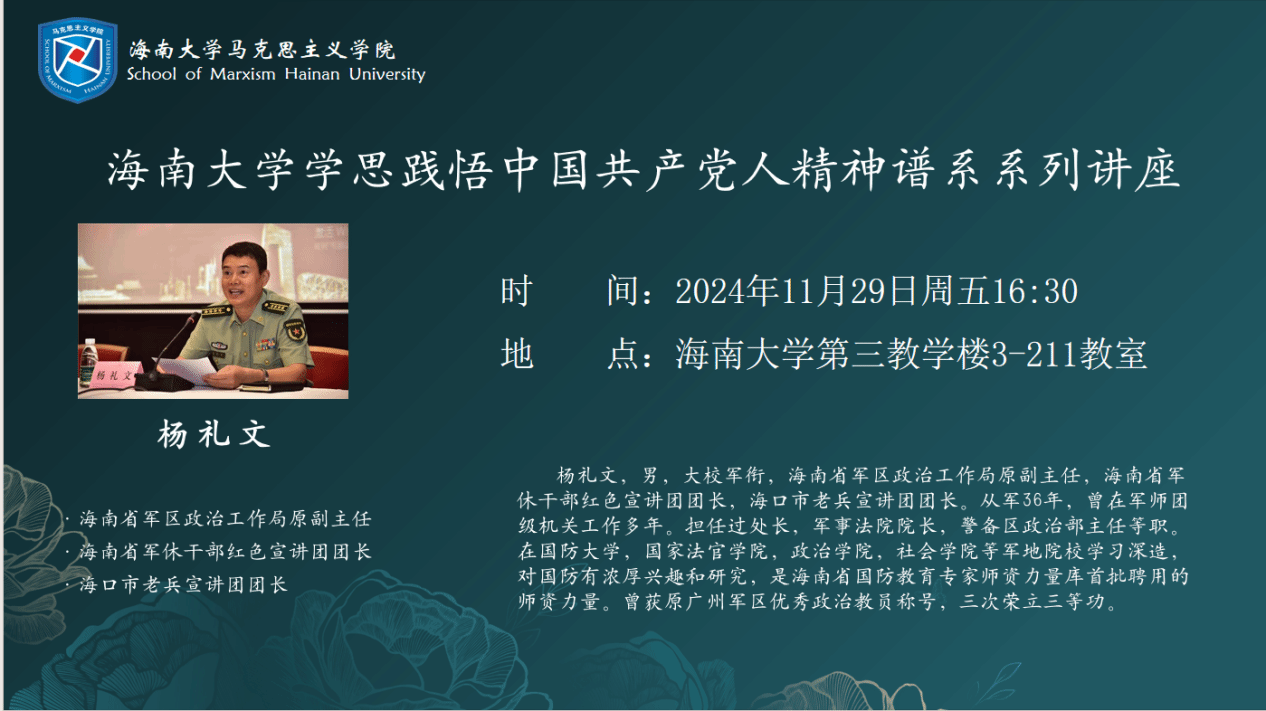 2024年11月29日,欧冠官方网站入口邀请海南省军休干部红色宣传讲团团长杨礼文大校作欧冠官方网站入口学思践悟中国共产党人精神谱系系列讲座报告。报告以“认识南海,热爱南海,捍卫南海”为主题,从南海的基本情况和复杂成因两个方面展开讲述。报告由凤翔书院郭孝伟老师主持,欧冠官方网站入口蔡文举副院长参加。