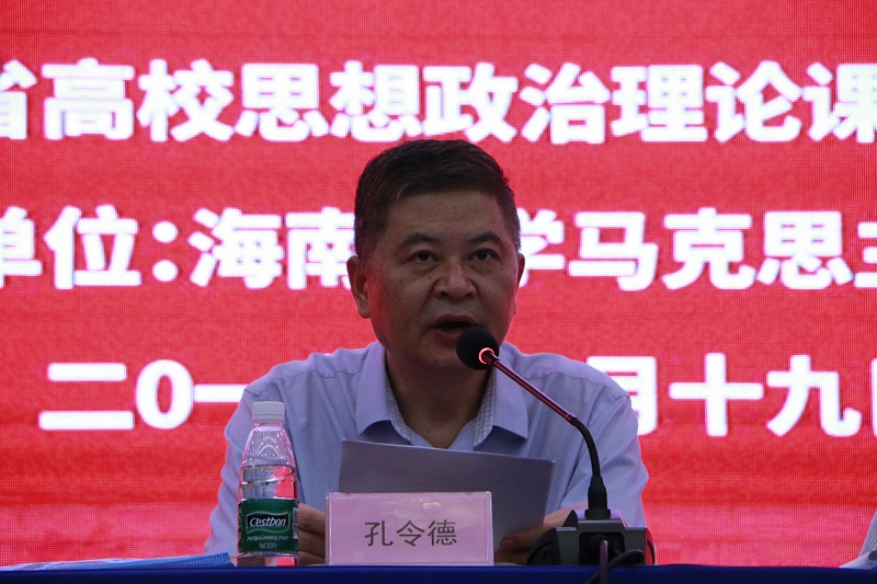 孔令德在开幕式上发表讲话,他对海南高校近些年在思想政治理论课建设方面取得成效给予了充分肯定,同时就进一步推进我省思想政治理论课建设提出了三点意见。一是要提高政治站位,学深悟透习近平总书记在学校思想政治理论课教师座谈会上的重要讲话精神。全省思想政治理论课教师要提高政治站位,深刻领会习近平总书记讲话的深刻内涵,要用新思想武装头脑,指导学校思想政治理论课建设的实际工作。二是要增强责任意识,扎实推进海南省高校思想政治理论课的对标建设。全体思想政治理论课教师要增强责任意识,对照习近平总书记“3.18”讲话精神、全国高校思想政治工作会议精神、全国教育大会精神和《新时代高校思想政治理论课教学工作基本要求》,补齐建设短板,抓好对标建设,守好自己的责任田。三是要积极改革创新,着力打造海南高校思想政治理论课建设的特色和品牌。海南的思想政治理论课建设要在突显海南自由贸易区和中国特色自由贸易港建设特色上着力打造一批政治站位高、海南特色强、育人效果好的思政课程品牌,提升海南思想政治理论课建设在全国的影响力。