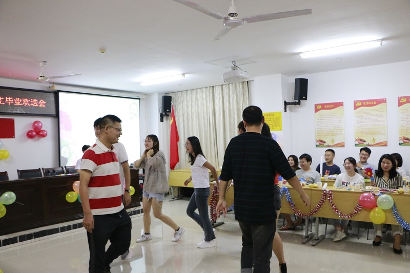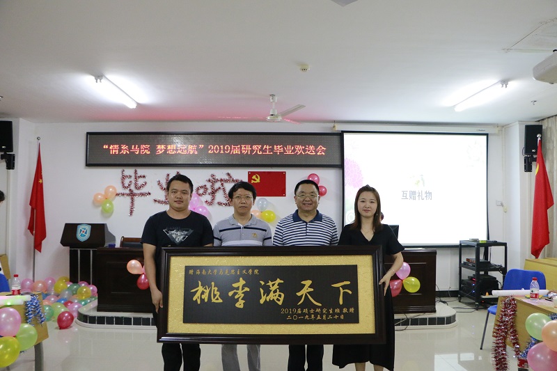 欢送会上,2019届研究生毕业生向学院赠送了“桃李满天下”的牌匾,段捷频、李英华和张君成老师代表学院向全体毕业生发放学院选宣传册和纪念品。研究生毕业生代表潘男和在校研究生代表张萌分别在晚会上发言。欢送会节目形式包含歌曲、二胡独奏、游戏等,现场气氛热烈,同学的精彩表演获得大家的热烈掌声。