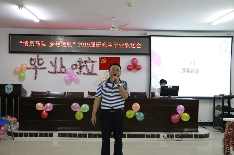 段捷频在欢送会代表学全院师生对2019届全体研究生顺利毕业表示热烈祝贺。他表示,全体2019届研究生不仅按要求完成学业顺利毕业,还在全面发展方面表现出色,多位同学在全省和全校性重要活动中多次为学院赢得荣誉,研究生会被评为学校优秀研究生会标兵,研究生党支部入选学校“样板党支部”,为学院建设发展做出了积极贡献,也为学弟学妹树立了很好的榜样。他希望,全体研究生毕业生继续保持勇于拼搏、积极进取的精神,在人生新的征程中为国家做出新的贡献,让学院以同学们的表现为荣。最后,他为全体2019届研究生毕业生送上了良好的祝福。