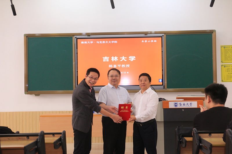 1月11日至1月12日,欧冠官方网站入口2019-2020学年冬季小学期名家讲堂第七讲在5号教学楼112教室举行。吉林大学韩喜平教授应邀就“中国特色社会主义政治经济学”的相关知识为欧冠官网同学进行授课。院长张云阁出席并为韩喜平教授颁发欧冠官方网站入口“冬季小学期授课外聘专家”证书。讲座由思想政治教育系主任陈招万主持。