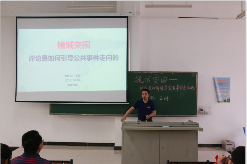 6月19日,欧冠官方网站入口“学习讲堂”在欧冠官方网站入口第五教学楼111教室再次开讲,海口日报社党委副书记、副社长王琳作题为“镜城突围——评论是如何引导公共事件走向”的专题讲座。讲座由学院党委书记段捷频主持。欧冠官网大一、大二、大三全体本科生参加本次活动。