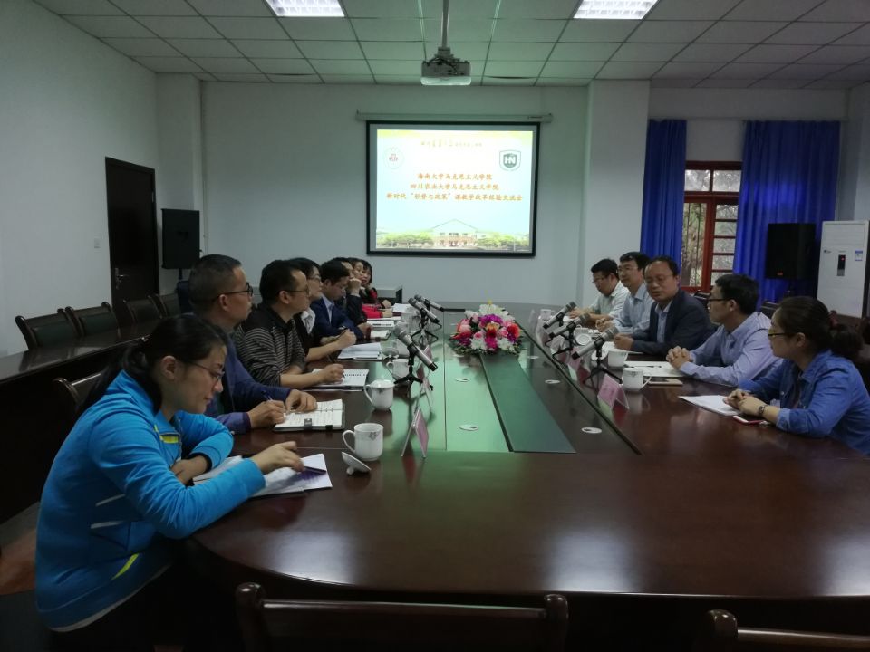 为深入贯彻全国高校思想政治工作会议精神,贯彻落实教育部《关于加强新时代高校“形势与政策”课建设的若干意见》文件精神,9月12日至15日,形势与政策教研室赴四川师范大学欧冠官方网站入口、四川农业大学欧冠官方网站入口展开交流学习。欧冠官方网站入口副院长王善、吴朝阳和校党委宣传部理论教育科科长王群生、校学生处思想教育科科长肖洒、形势与政策教研室主任温小平等一行5人参与。