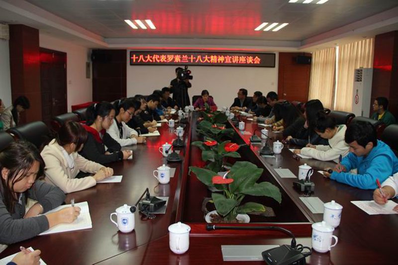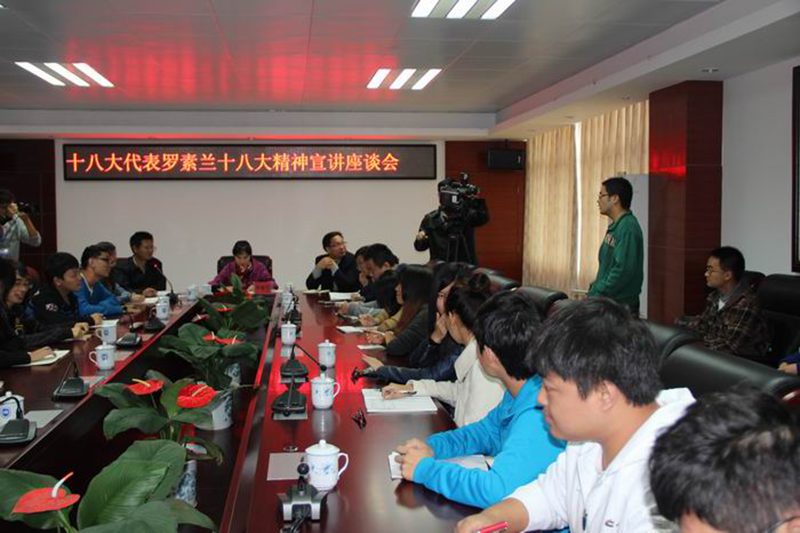 12月6日上午,为了深入学习宣传贯彻党的十八大精神,在校党委宣传部的指导下,欧冠官网在学校办公楼四楼会议室举行十八大精神宣讲座谈会,十八大代表罗素兰教授与欧冠官网师生畅谈十八大精神。校党委宣传部部长张继友、副部长谭勇,欧冠官网学工办主任周郭军出席座谈会。座谈会由张君成老师主持。