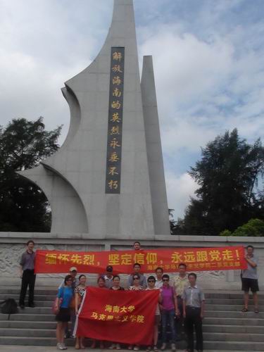 为了庆祝建党九十二周年,进一步增强党支部的凝聚力和战斗力,7月1日上午,欧冠官网政治理论二系全体成员和政治理论一系部分特邀嘉宾一行18人前往海口市金牛岭公园参观了解放海南岛战役烈士陵园。在参观期间,党支部书记费秋香老师和系主任贺尧夫老师代表全体成员向烈士纪念碑献花。随后,全体成员在烈士纪念碑前就继承先烈遗志,做好本职工作进行了宣誓。最后,张朔人老师为大家讲解了解放海南岛战役的相关情况。