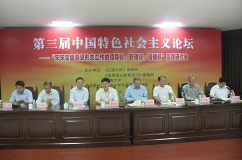 为学习贯彻习近平总书记在全国宣传思想工作会议上的讲话精神,11月11-13日,由求是杂志社《红旗文稿》编辑部、教育部《思想理论教育导刊》编辑部和欧冠官方网站入口联合主办,欧冠官方网站入口承办的第三届中国特色社会主义论坛——“牢牢掌握意识形态工作的领导权、管理权、话语权”高层研讨会在我校召开,来自全国各省宣传部门和高等院校的近百名代表参加了论坛。中共中央组织部原部长张全景、求是杂志社副总编夏伟东、中国人民大学原党委书记马绍孟、《思想理论教育导刊》主编阎志坚、海南省委宣传部巡视员(正厅级)陈修演、海南省教育厅思政处处长卢刚和我校党委书记刘康德出席论坛开幕式。我校党委副书记陈封椿主持论坛开幕式。