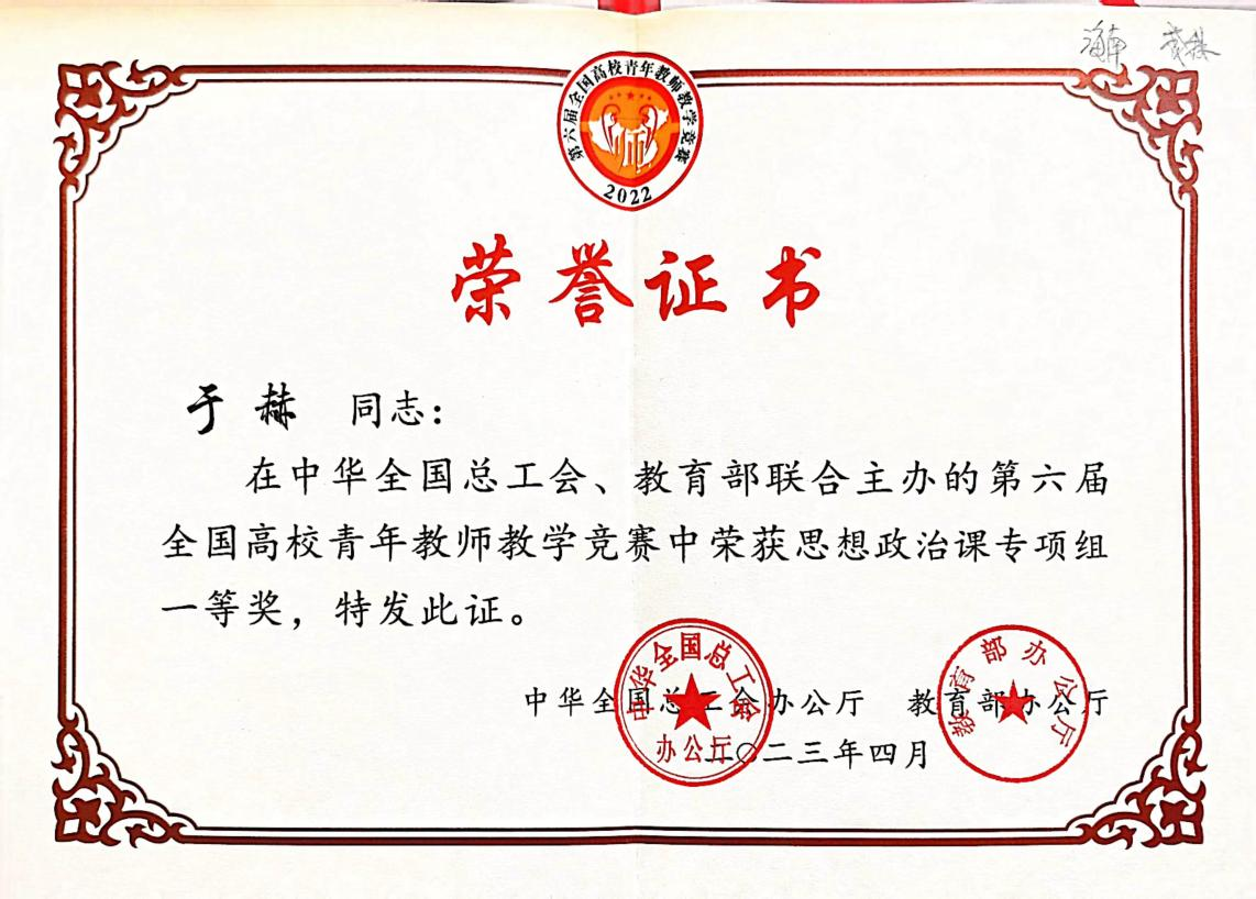 欧冠官网于赫老师代表海南省与来自全国多所高校的青年教师进行了同场竞技,主讲了《习近平新时代中国特色社会主义思想概论》,凭借扎实的教学基本功和良好的综合素养,在竞争中脱颖而出,荣获思政组一等奖,取得了我校也是海南省在全国青教赛中的历史性突破,展示了欧冠官网青年教师的专业素养、教学水平和精神风貌。