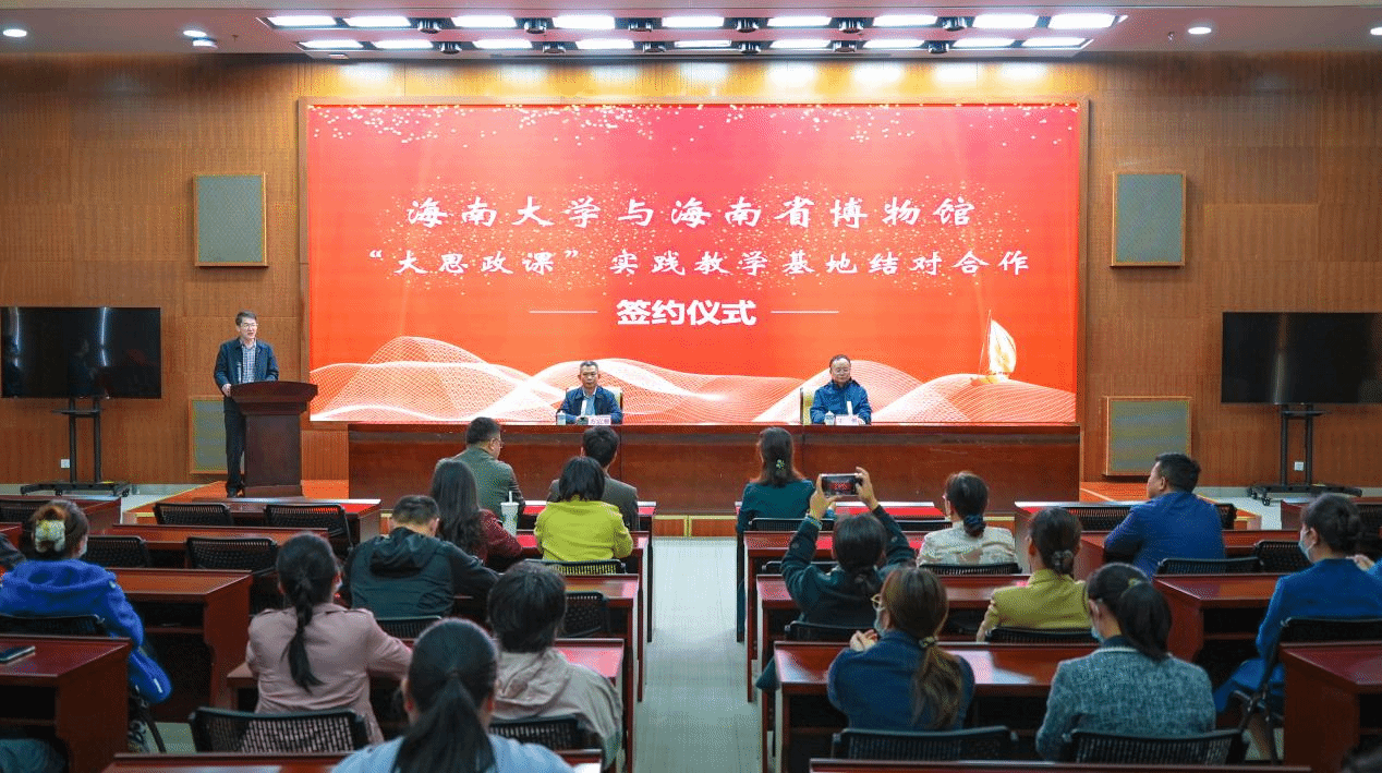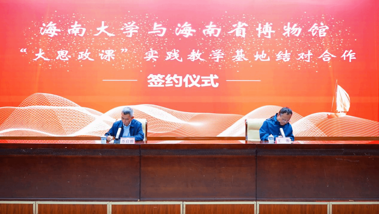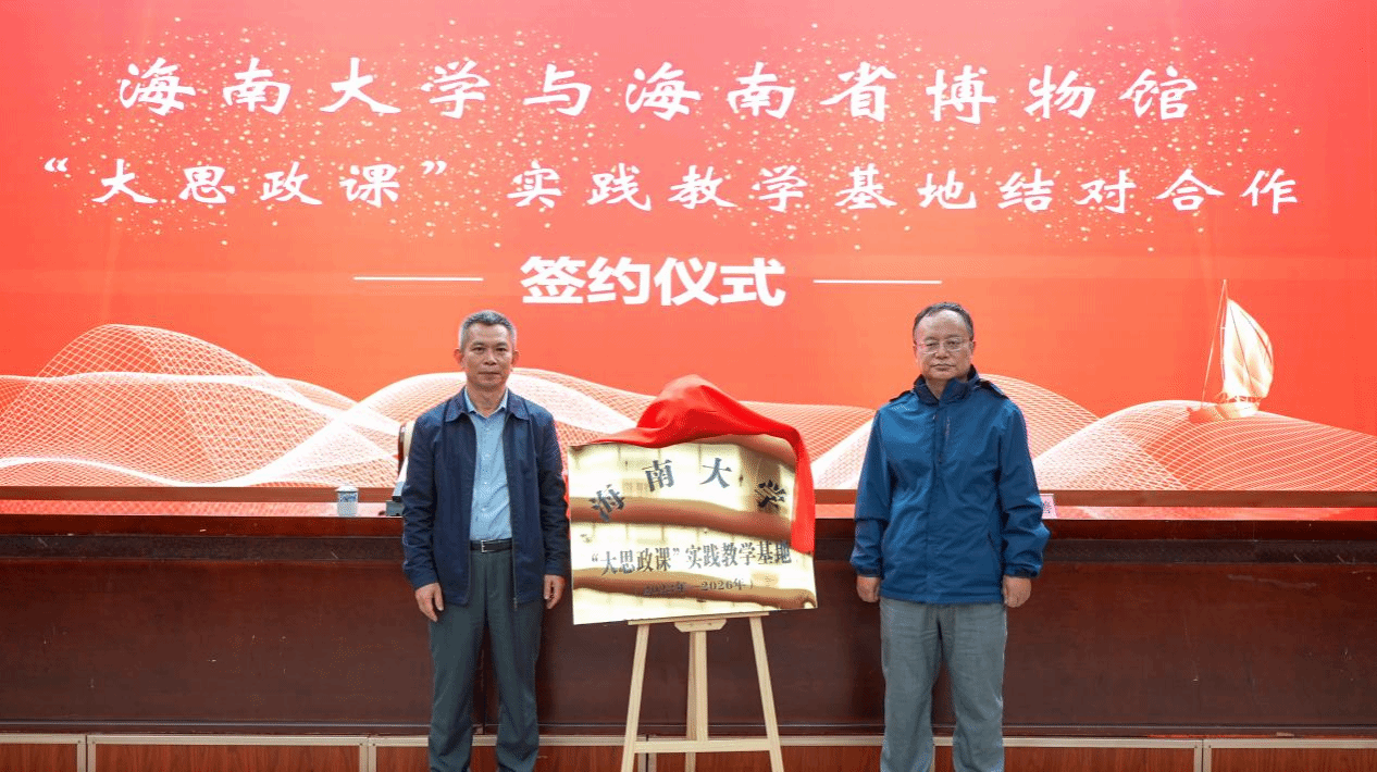 仪式中,海南省博物馆馆长苏启雅与欧冠官方网站入口副院长王善共同签署《“大思政课”实践教学基地结对合作协议》,并为“大思政课”实践教学基地揭牌。