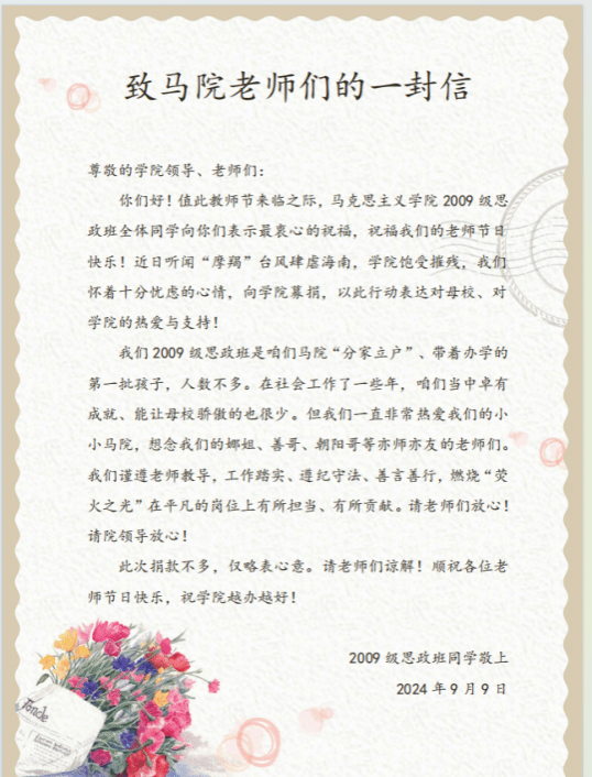 2024年9月9日,在即将到来的教师节之际,欧冠官方网站入口收到了2009级思政班全体同学的慷慨捐款,表达对学院的关心和支持。面对近期“摩羯”台风的严重影响,学院遭受了极大的困扰和损失。这笔捐款不仅帮助学院应对自然灾害带来的挑战,更是体现了同学们对母校的深情厚谊和责任感。