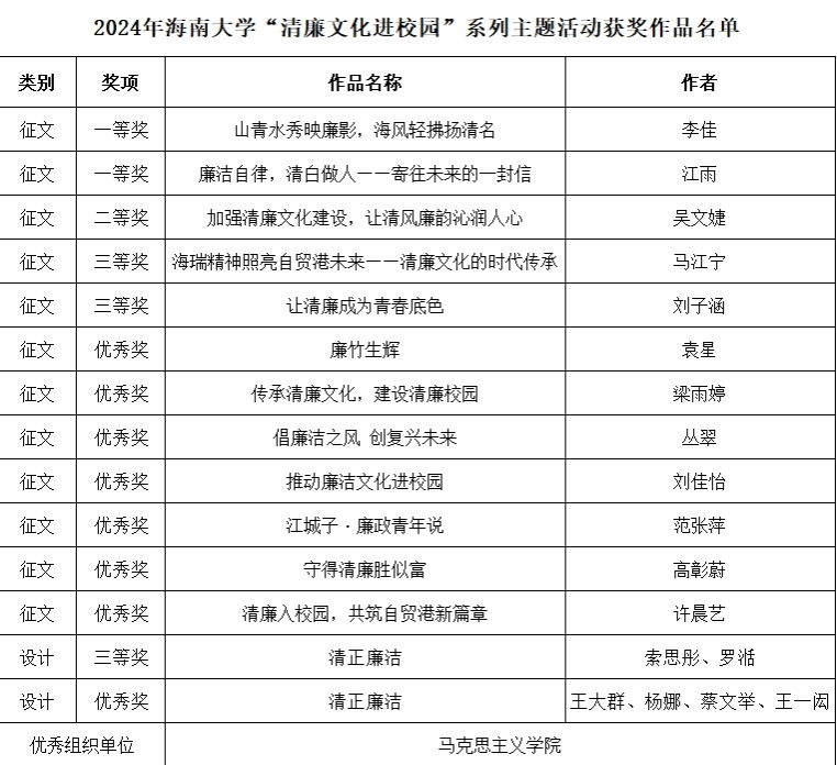 8月21日,中共欧冠官方网站入口纪律检查委员会公布了2024年“清廉文化进校园”系列主题活动的获奖名单。欧冠官方网站入口在本次活动中表现优异,多项作品获奖,其中征文类比赛获奖12项,设计类比赛获奖2项,成为获奖数量最多的单位,并被评为“优秀组织单位”。