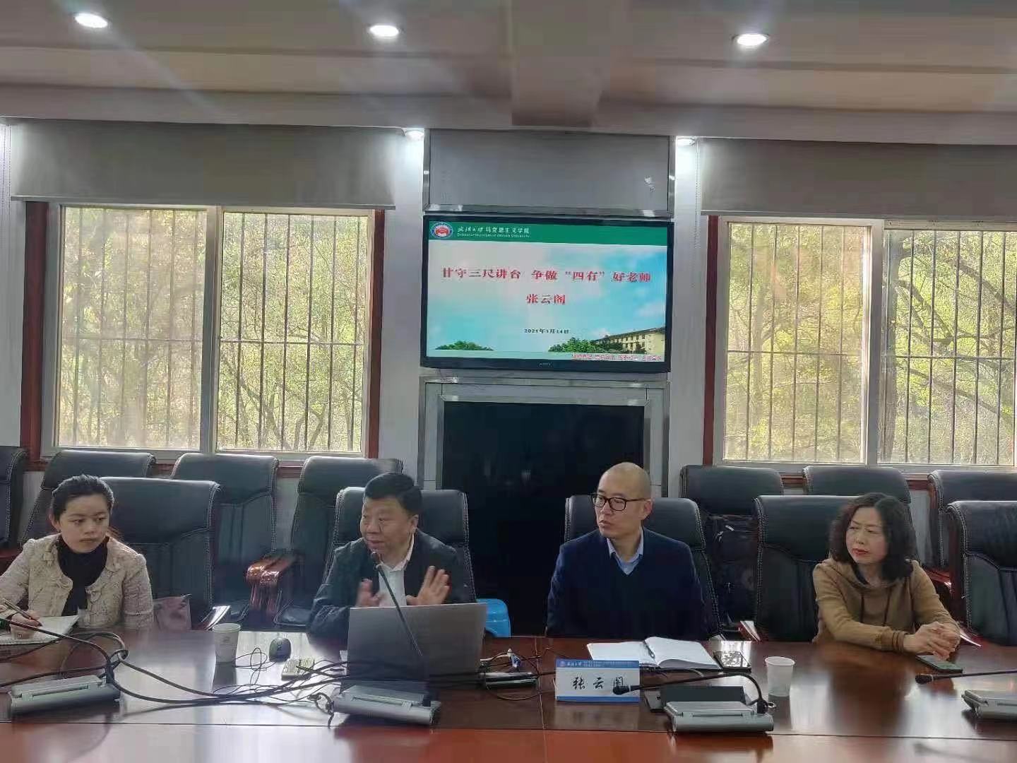 14日上午,应武汉大学欧冠官方网站入口的邀请,张云阁教授又为学院师生做了一场:甘守三尺讲台 争做“四有好老师”的师德师风报告。张云阁教授从教书育人是教育的本质要求、好老师是大学的灵魂、好老师必备的条件和实现“四有”好老师的路径四个方面,结合自身的工作经历,报告了自己的理解与体会。张教授的报告内容丰富、案例生动、语言幽默,教育性强,得到了与会师生的高度评价。报告结束后,张教授还回答了师生们提出的问题。