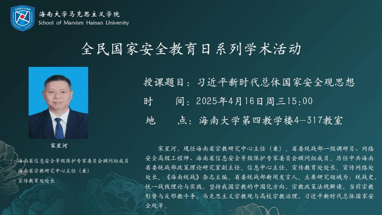 2025年4月16日下午,欧冠官方网站入口邀请海南省信息安全等级保护专家委员会顾问组成员宋星河,以“习近平新时代总体国家安全观思想”为主题,从历史文化、风险挑战与实践路径三个维度为学生开展讲座。